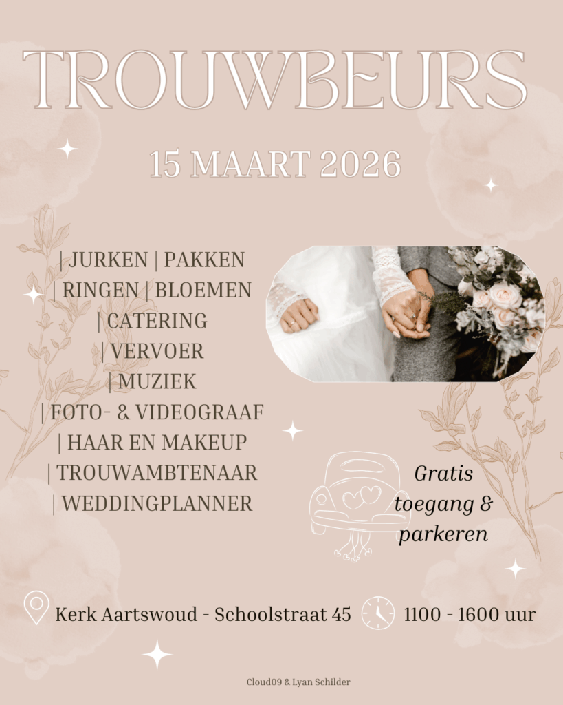 Op 15 maart 2026 vindt een sfeervolle trouwbeurs plaats op de bijzondere locatie De Kerk in Aartswoud. Deze historische setting vormt het perfecte decor voor aanstaande bruidsparen die op zoek zijn naar inspiratie voor hun grote dag. Tijdens de trouwbeurs maak je kennis met diverse trouwleveranciers, van bruidsmode en fotografie tot styling en entertainment. Laat je verrassen door creatieve ideeën, persoonlijke adviezen en de nieuwste trends op trouwgebied. De intieme en warme sfeer van de kerk zorgt voor een ontspannen beleving waarin je rustig alles kunt ontdekken. Of je nu net verloofd bent of al volop aan het plannen, deze trouwbeurs helpt je om jullie trouwdag nog mooier te maken